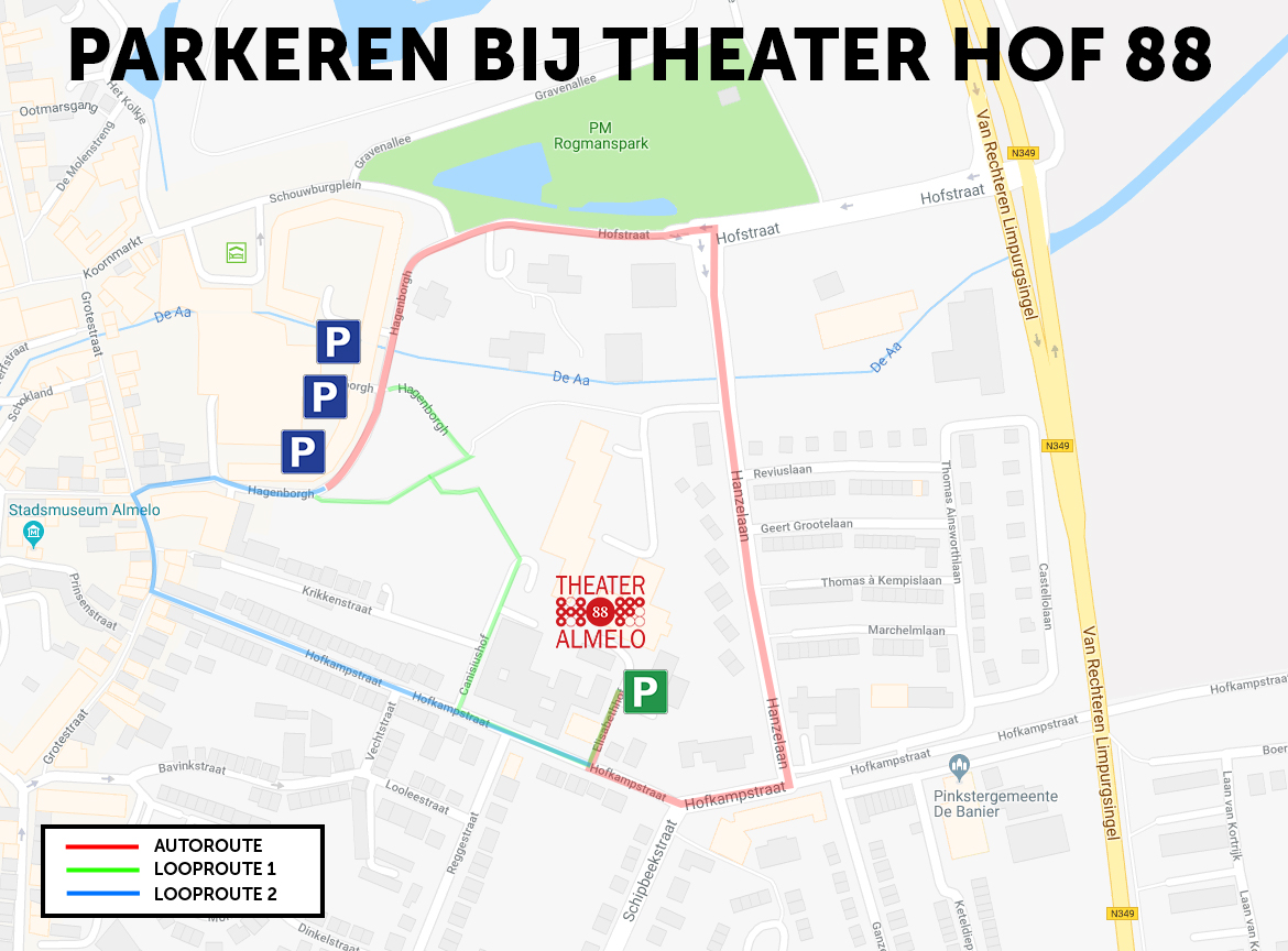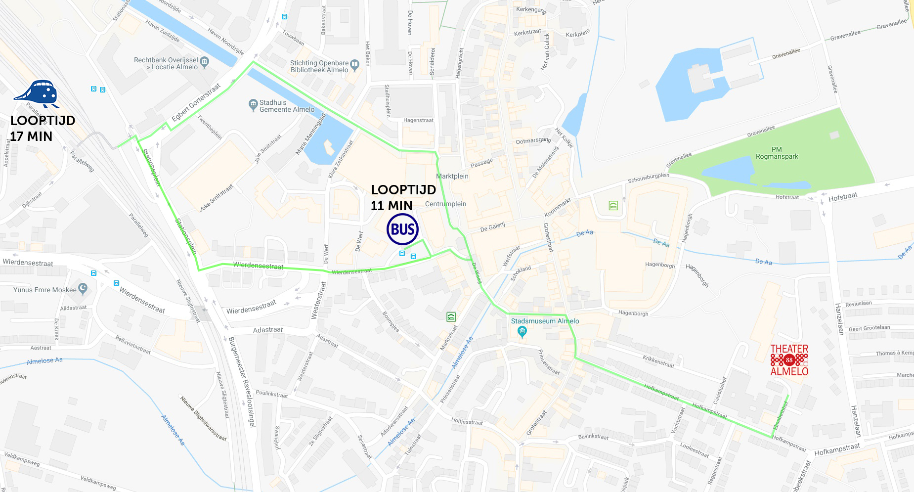 Komt u met het openbaar vervoer naar Theater Hof 88? De dichtstbijzijnde bushalte is Bushalte Centrumplein. Vanaf daar is het ongeveer 11 minuten lopen naar Theater Hof 88. Het dichtstbijzijnde treinstation is Almelo Centraal. Vanaf Almelo Centraal is het ongeveer 17 minuten lopen naar Theater Hof 88. KLIK HIER voor een grote versie van de kaart.